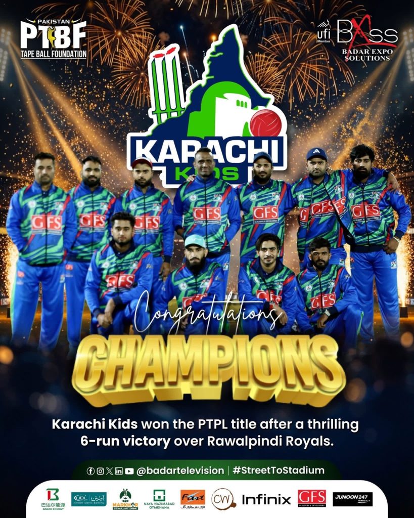 In a thrilling Final Match of the UBL Ameen Pakistan Tape-Ball Premier League (PTPL) 2025, Karachi Kids emerged victorious against Rawalpindi Royals, winning by 6 runs! A match full of skill, strategy, and heart-stopping moments saw Karachi Kids lift the trophy and make history in tape-ball cricket. Proudly organized by Badar Expo Solutions in collaboration with the Pakistan Tape-Ball Foundation (PTBF).